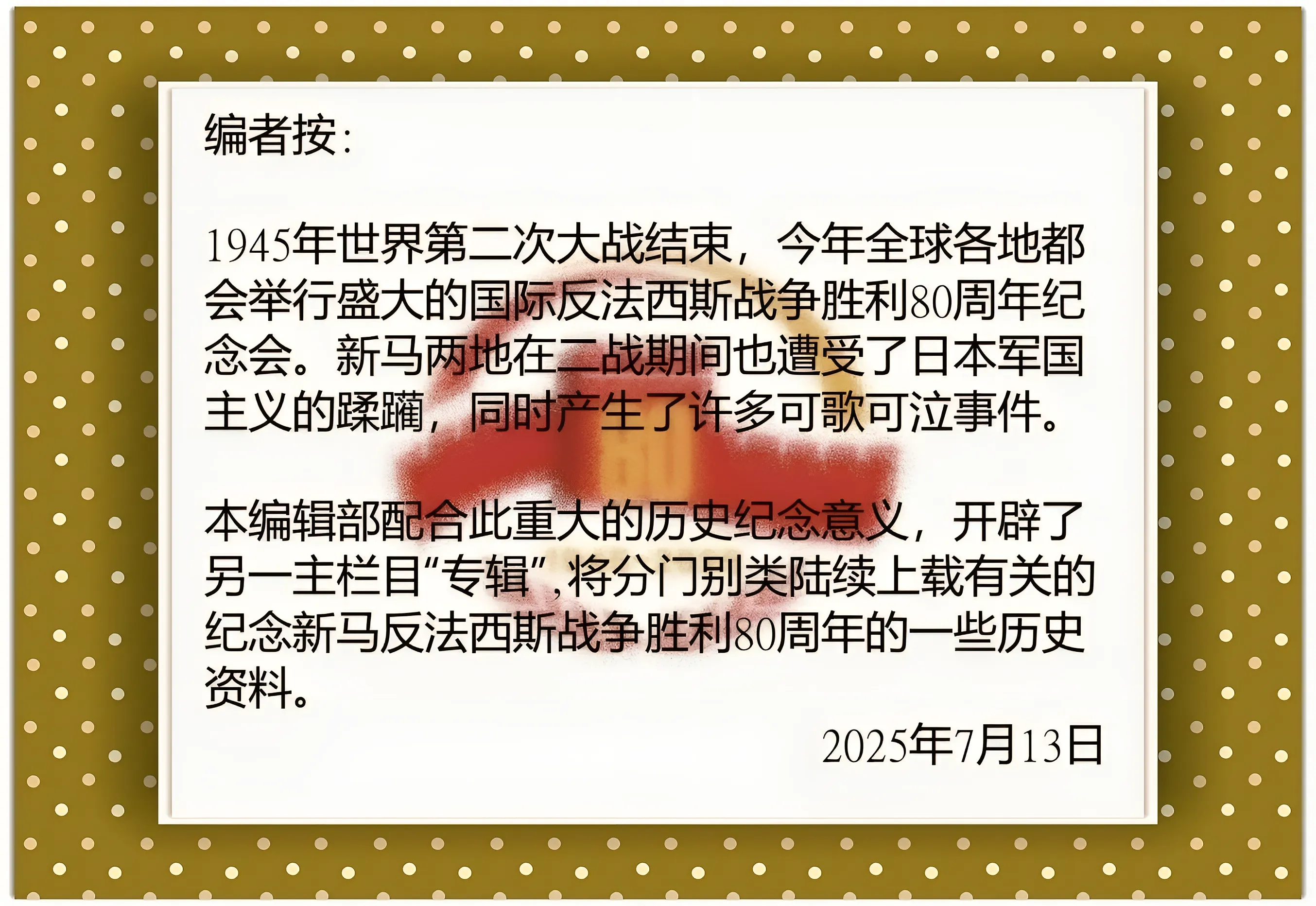 01  有关新马抗日时期书籍(全书) 02  有关新马抗日时期书籍(节录封面,目录与封底) 03  南洋抗日文史 04  图书画册 05  照片 (尚在处埋) 06  南洋华侨机工 07  武汉合唱团南洋筹赈巡回演出 08  新中国剧团南洋筹赈巡回演出 09  新马抗日歌集 10  新马抗日歌曲录音、录像 11  附录:中国抗战歌曲、世界反西斯歌曲