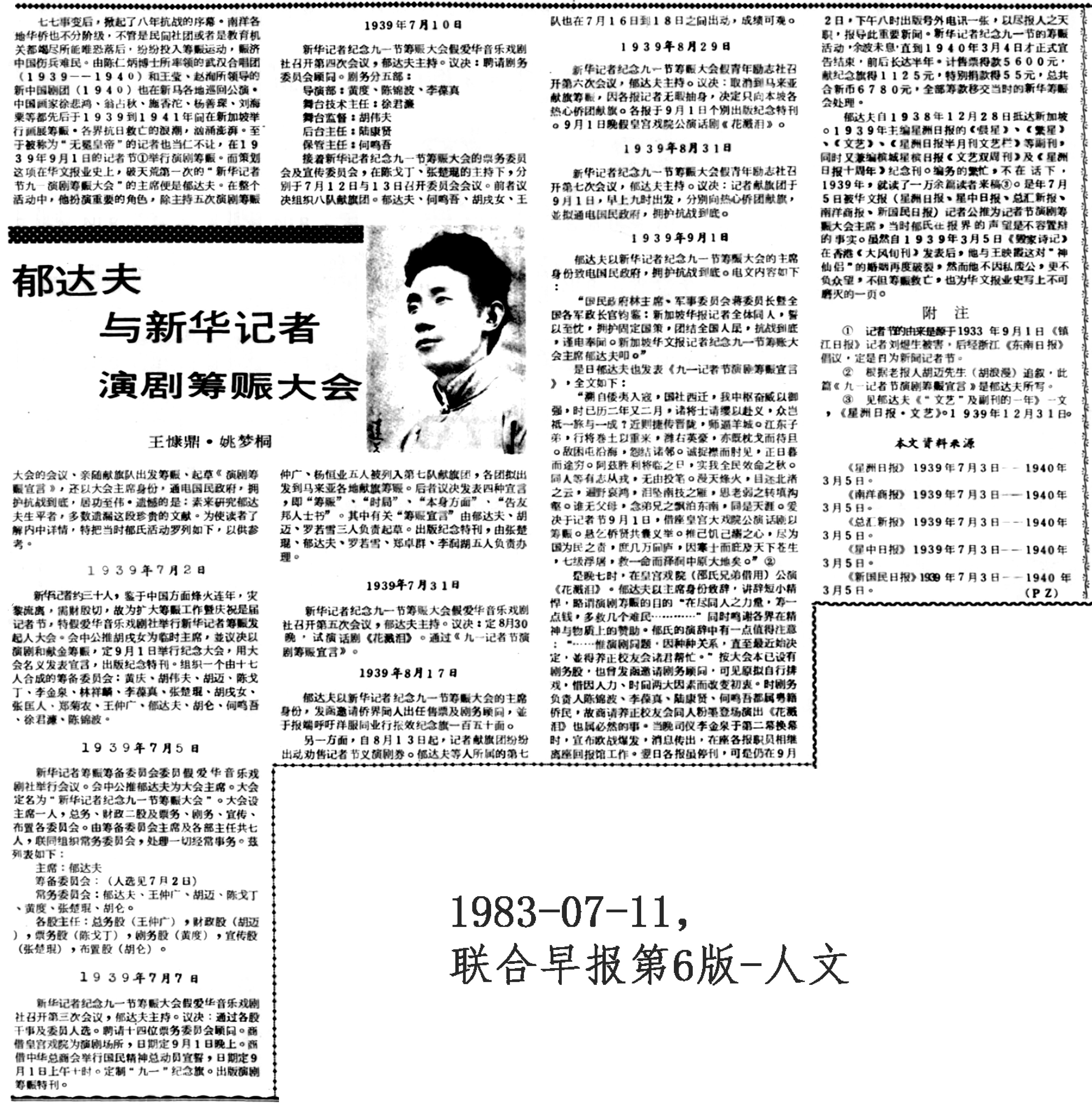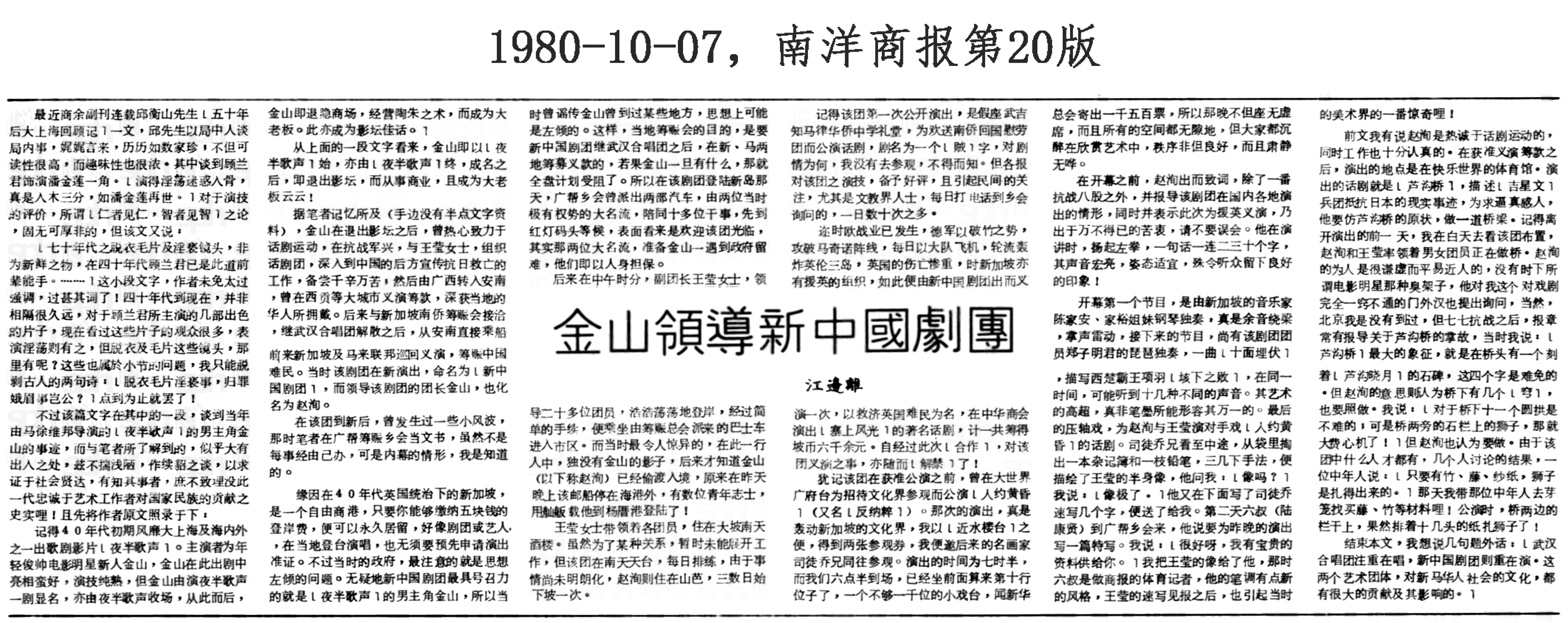 01 东南亚华文戏剧概观(赖伯疆,中国戏剧出版社,1993-01) 02 金山领导新中国剧团(江边离,1980-10-07,南洋商报第20版 03 早年麻坡戏剧运动(郑昭贤,2020-08-06) 04 文化人邂逅星洲——从1939年谈起(姚梦桐,怡和世纪第48期,2023-09-15) 05 郁达夫与新华记者演剧筹赈大会(王慷鼎、姚梦桐,1983-07-11,联合早报第6版-人文)